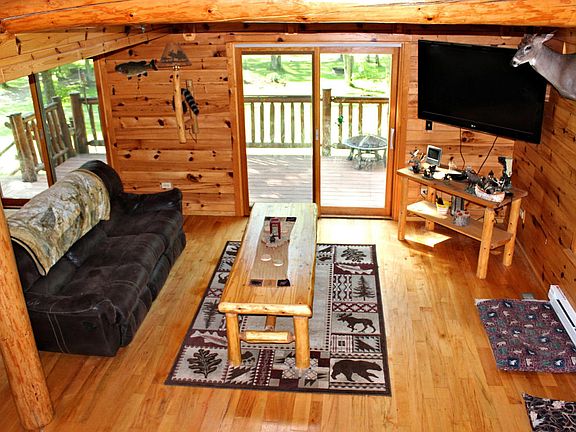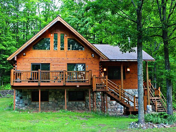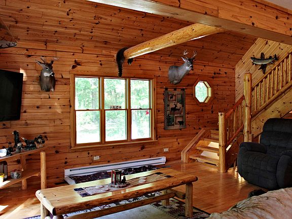 20 acres of complete privacy. This 3 bed/3 bath full-log home includes upper loft & full basement. Built in 2000 home has a knotty-pine interior which makes the whole home sparkle. Main floor laundry & huge loft for guest and children. Plenty of yard yet nestled in the hardwoods. The hyper-insulated home includes an efficient outdoor wood burner to keep costs low. Majestic 40 x 38 barn for the tools & the toys w/ hunting blind & food plots to enjoy all nature has to offer. Large deck off living room, take in the splendor. Deeded access to clean & bountiful Bows Lake included. Close to town.