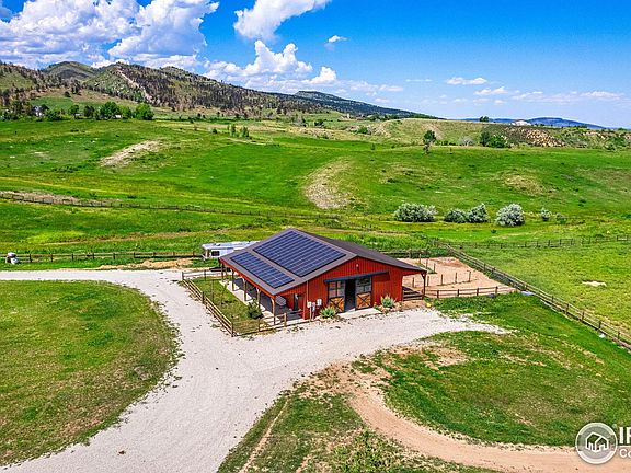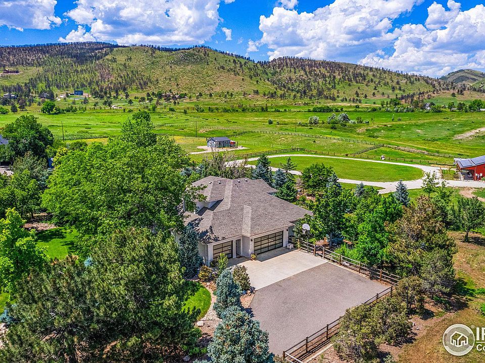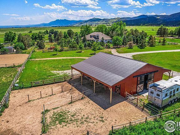 Imagine waking up to your own private sanctuary, away from the hustle of town and taking in the sunrise while you sit by the real wood burning fireplace. Walk the grounds and bask in the sounds and colors in the lovingly maintained perennial flower gardens as you follow the flagstone pathways to your 1,728 square foot barn. Living in this updated farmhouse is the Colorado dream! It boasts a generous main floor with 2706 sq. ft. of an open floor plan with vaulted ceilings, and light pouring in an abundance of windows. The property provides tranquil living on a cul-de-sac in an enclave of custom homes surrounded on 3 sides by 88 acres of a protected conservation easement. The almost 5-acre property features a 4BD/3BA house, barn, paddocks, plus a pasture all within close proximity to miles of trails. Bike up Lee Hill or to Jamestown right out your door! Conveniently located off hwy 36 and Nelson Rd, getting to downtown Longmont (9 miles) or Broadway (6 miles) in Boulder is a no hassle drive. Inside you'll find low maintenance Saltillo tile throughout the main floor, creating ease of flow from the foyer to the living room. With a main floor primary suite, an office or guest room, and laundry you can live and work seamlessly. The two stone crafted fireplaces are focal points of each roomy living room where you can take in views of the snow dusted flatirons to the south or the breathtaking sunsets over the foothills to the north. Don't miss the Chef's professional appliances, leathered stone countertops, a farmhouse sink and walk-in pantry. The red barn built in 2018 is stunning! Care was taken when it was designed for functionality and optimal animal health/comfort. It is comprised of three oversized rubber-matted Classic Equine stalls, heated Nelson automatic waterers, Arlo cameras, corner feeders, Dutch doors, individual paddocks per stall that open to the back pasture, timed lights, and bridle/halter hooks. Come see all this move-in-ready Ranch has to offer!