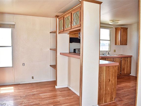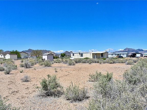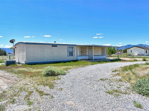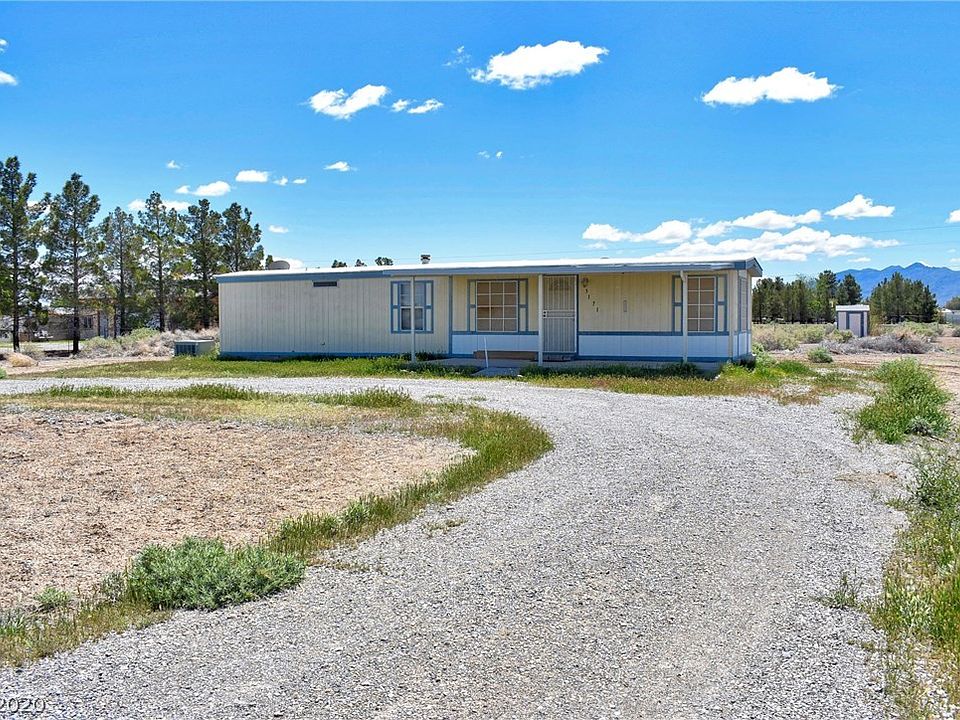 Just shy of 1 acre, this property offers circular driveway, well w/pump house, septic, & 728 sqft home w/awesome mountain views! Kitchen offers breakfast bar, eating nook, stainless sink + stove, & great light! Living rm w/built-ins, & views of Last Chance Mtn Range! Covered front porch & back patio, security screen, partially fenced, additional 8x8 detached shed, & matching pump house. Close to golf, gaming, wineries, trails & 1hr to Las Vegas!