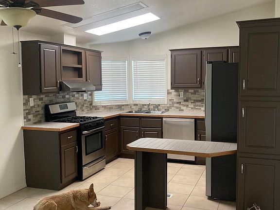 2 bedroom 2 bathroom Manufactured home with detached 528 square foot garage built in 2015 has been converted to a finished, insulated, air conditioned workshop. Leave as is, converted back to a 2 car garage or turn into additional living space. Home boast upgraded tile master bathroom 2023, New shingle roof in 2016, all new window 2023, full length covered front deck with metal roof accessible by ramp or steps, wide interior doors and hallway & textured and painted walls. Alley access through entirely chain link fenced backyard with storage shed.