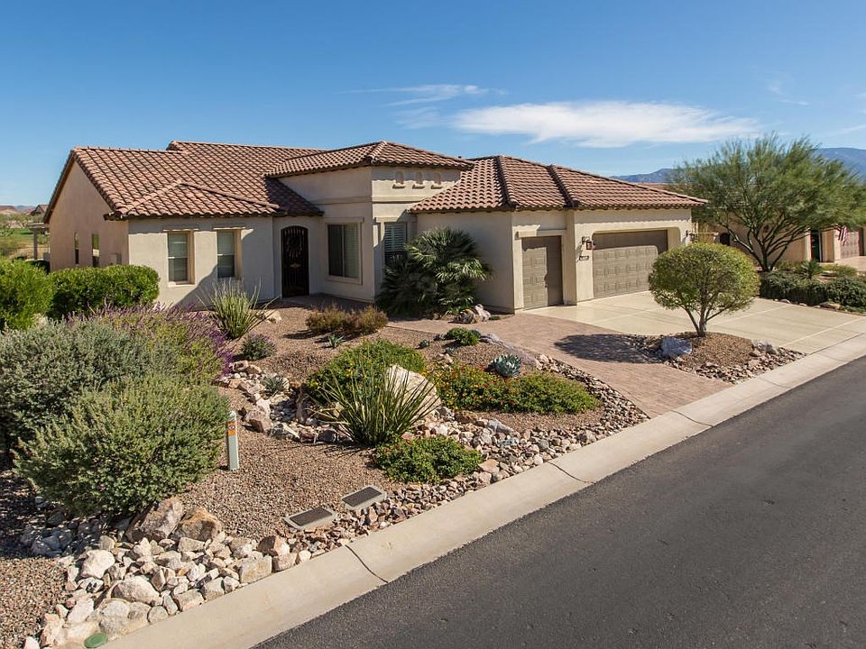 This Impeccable popular Covina Model sits on one of most Captivating PREMIUM LOTS. Enjoy the colorful panoramic mountain views, lush green grass of the golf course & tasteful mature landscaping from either your cozy covered patio or under the expansive Pergola. Enter the front entryway to experience the many amenities such as 18" ceramic tile thru out, plantation shutters thru out, luxurious kitchen w/granite countertops, full height backsplash, SS appliances, upgraded cabinetry, center island, bright open living area, split bdrm floor plan w/en-suite bath in 2nd bdrm. Exterior of the home was just painted. Live your active lifestyle in the community's state of the art fitness center, indoor pool, outdoor resort style pool, tennis, pickleball, golf, on-site Bistro, Spa, Salon, & Barber.