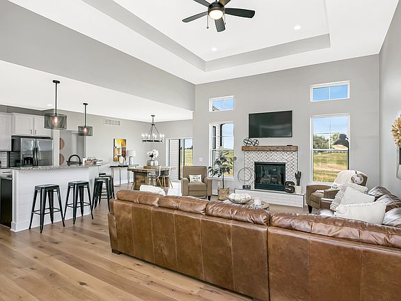 The most popular of all our ranch floor plans and currently our Sycamore, IL model home. A split-bedroom ranch with 13-foot vaulted ceiling, and open-railing staircase leading to a full basement that can be finished by request. The large angled island with breakfast bar is a great place to gather while entertaining, and the breakfast area is large enough to hold a table for family meals. The master suite contains a tray ceiling, and the double sinks and luxurious shower make the master bath the perfect retreat after a long day.