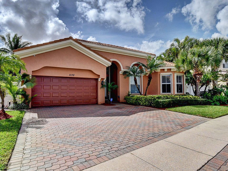 Prepared to be impressed! This immaculate rarely available one story Carrara model with pool on oversized cul-de-sac lot, ready to move in! Freshly painted interior, extended driveway, accordion hurricane shutters. Great layout, tiled floors and newer carpet in bedrooms, tray ceilings with recessed lighting, kitchen with wood cabinets, granite counter tops, breakfast nook! Private fenced backyard with lush tropical lanscaping to relax by the salt water pool or entertain under covered patio.New pool equipment with AquaLogic remote and variable speed pump. Master suite with bay window seating area, large walk-in closets, master bathroom with dual sinks, shower and separate tub. Olympia is Wellington's premier gated community with resort-style clubhouse surrounded by 10 acre recreational area