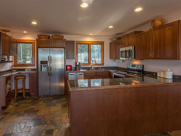 Timeless Classic Daylight Custom Rancher no expense spared. Immaculate details w/Quality throughout! Incredible Mt views from floor to ceiling windows, solid oak floors, 6 panel doors, LVT entry carried through kitchen & dining area. Large walk-in pantry. Granite counters. Gorgeous master suite w/east facing deck. Travertine in bathroom w/jetted tub. 2 H20 heaters radiant gas heat. Oversized garage ceiling & walls finished in cedar. 40x40 barn, 3 storage sheds. Land is 1/2 pasture, 1/2 park-like forest.