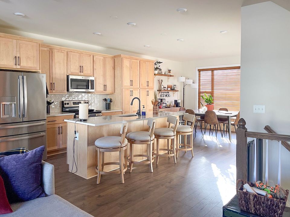 This spacious townhome features modern finishes throughout! The kitchen includes quartz countertops, stainless steel appliances, sleek cabinetry and an oversized kitchen island that provides plenty of extra seating! The outdoor balcony can be found just off of the dining area. A half bath is available on the main level, which is ideal for guests & entertaining.