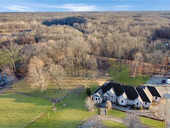 VIDEO TOUR-> https://youtu.be/3UbCCe_tGQU Custom built, well-maintained home sitting on 18 acres! Boasting 5 bedrooms, each with bathroom access. The master suite and 3 bedrooms are located on the main level along with an office and laundry room. The open concept kitchen and breakfast room overlook the nature filled backyard. Enjoy the inviting atmosphere of two gas fireplaces. The walkout, finished basement includes a full second kitchen, 5th bedroom with bathroom, craft room, game room, fitness room, along with 5 extra storage rooms. The 2 geothermal systems keep utilities at a $300/month average. In addition to the attached 3 car garage, you’ll find a 40x32 metal pole building with concrete floors. The property itself features a great mix of pasture and timber, perfect for animals, large and small! Approximately 3 acres of pasture and 6 acres of timber are fenced, with the fencing in great condition. You’ll enjoy watching all of the wildlife from the oversized deck.