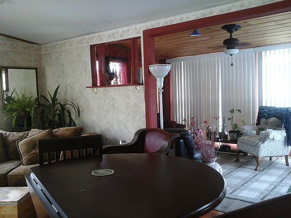 2 bedrooms, 1 full bath. Open kitchen living/dining areas, porches, newer furnace, wood stove for supplemental heat, large storage shed. Stream on the property, room for gardens, small animals or fowl. Views overlooking nice green pastures and open fields.