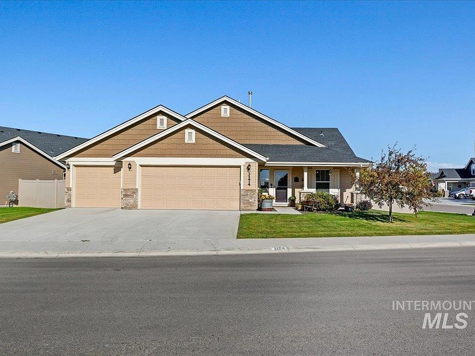 Discover this remarkable home featuring a three-car garage and a split bedroom layout, ideally situated on a spacious corner lot at the entrance of a cul-de-sac. This thoughtfully designed residence includes three generously sized bedrooms and two bathrooms. The open concept living room and kitchen create a welcoming atmosphere perfect for entertaining or culinary adventures. The kitchen is equipped with granite countertops, a spacious island, upgraded cabinets, and stainless-steel appliances, including a gas range. Additional highlights encompass a tray ceiling in the great room, luxury vinyl plank flooring, windowsills and skirting throughout, two-tone paint, and more. Don't miss the expansive backyard, which offers ample space for a play area, garden, parking for your boat or trailer, or all three. This home is HERS and Energy Star rated, ensuring excellent energy efficiency. Experience the best of both worlds with serene country living and city conveniences at your fingertips. Leave the daily hustle and unwind in the tranquil community of Greendale Grove in beautiful Star, Idaho. Relish the charm of small-town living while being just minutes from Eagle and Meridian. Whether you enjoy cycling, peaceful strolls, or golfing at the nearby River Birch Golf Course— this home and community will cater to your lifestyle.