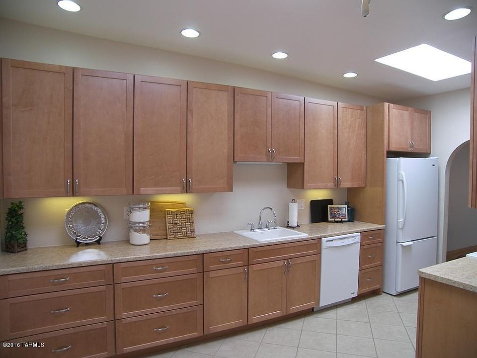 End unit TH has fantastic newly remodeled kitchen with high ceilings, recessed lighting and arched opening to dining area. This home lives big for a cozy smaller home. Spacious living room has sliding doors to back yard and screened porch. Front guest BR doubles well for den/ofc area with vaulted ceiling and large arched window looking out to front courtyard. Executive height vanity in MBA & Granite in hall bath. All nicely updated, upgraded and well maintained. Newly landscaped rear yard has open patio area. Plenty of storage cabinets in roomy 2 car garage. All appliances convey. Quality furniture per inventory is available by separate bill of sale. Located in a quiet, quaint village like neighborhood with winding streets & beautiful mountain views near Desert Hills and Canoa rec centers.