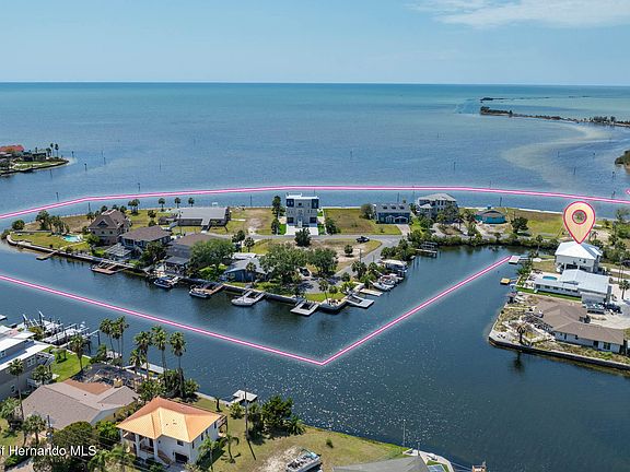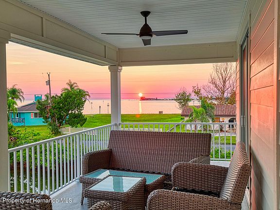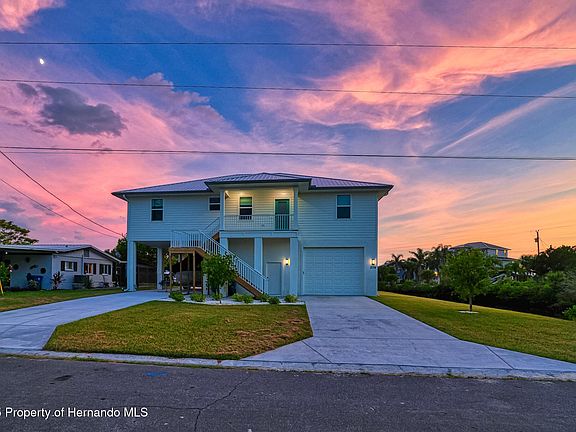 BRAND NEW COASTAL HOME WITH BREATHTAKING GULF VIEWS - MOVE-IN READY! Why wait to build when you can own this stunning 2024-construction, turnkey home in the heart of Hernando Beach? Enjoy panoramic sunset views over the Gulf from this elevated retreat, sold fully furnished—just bring your toothbrush! This oversized lot boasts 175 feet of brand-new seawall and a massive 32x10 floating dock with dual ramps, perfect for large boats. There's ample space to add a pool and park an RV or trailer on the side. Inside, enjoy 9' ceilings, spray foam insulation, impact-rated sliders, metal roof, Hardie board siding, and premium finishes throughout. The bright and open layout connects the living, dining, and kitchen areas, centered around a 4-panel slider that opens to a spacious deck with sweeping water views. The primary suite faces west, offering a picture-perfect sunset view, a spa-style en-suite bath with dual sinks, a walk-in shower, and a large closet. On the opposite side, two additional bedrooms—one with balcony access—share a second full bath with double vanity and a nearby laundry room. On the lower level, the home is raised to nearly 20' above sea level, creating a 15.5' wide x 12' tall carport—tall enough for a 28' center console boat—alongside a single garage bay and extra storage space. Hernando Beach is a vibrant waterfront community that offers the best of coastal living—boating, kayaking, paddleboarding, fishing, and more. Just minutes from the world-famous Weeki Wachee Springs, residents also enjoy close proximity to shopping, dining, hospitals, and top-rated schools. The community is golf cart friendly and allows short-term rentals with no deed restrictions, making it perfect for full-time residents, part-time snowbirds, or investors. The Suncoast Parkway offers easy commuting to Tampa, Brooksville, and beyond.