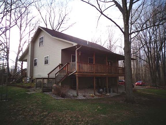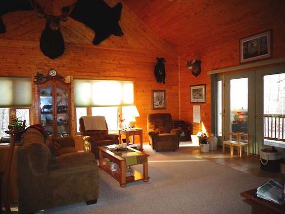 If you want seclusion, this is it. 60 acres +/- comes with this beautiful custom built home, hickory cabinets in the kitchen, tongue and groove cedar in the main living space, cathedral ceiling, spiral stairway, loft, porcelain tile and carpet on the heated floors, 8x40 deck on front and back of home, whole house generator, two garages 40x68 and 24x32, hoome is heated by hot water heat with wood stove and propane, central air, full kitchen in lower level. Workshop/garage has 3 phase power, heated and finished. Large stocked pond with gazebo nearby which has power to it. Wildlife galore right in your back yard.