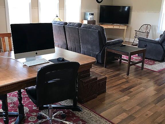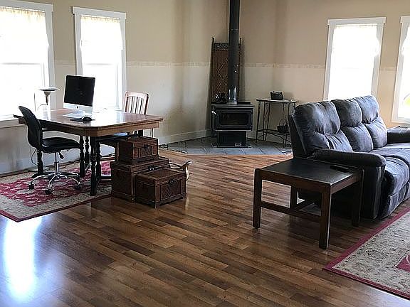 For sale by owner. This unique 2-story house features 3 bedrooms with lots of living space on both stories. Hard surface floors throughout the house - laminate, ceramic and porcelain tile and some vinyl. There is a large family room with a wood stove for cozy winters. The dining room has patio doors leading to a deck for easy summer grilling. The laundry room, one bedroom and two 3/4 bath (one is handicap accessible) are on the main floor. There is a large hobby room - we used it as a gym and later a pantry with room for stocking up. Extra wide hallways (4' to 6') and extra wide stairs (4') are easy to use to the second story. Upstairs, there are two bedrooms (one extra large), full bath, storage areas, skylights and a large sitting room overlooking the back field to a little creek. French doors are in place, waiting for a walkout deck. The washer/dryer, dishwasher, water softener and well pump were replaced within the last 9 months.