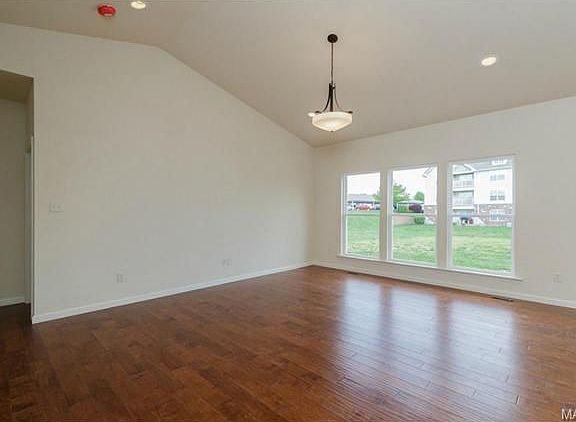 New construction by Fischer & Frichtel! This 3 bedroom, 2 bath ranch is under construction and scheduled for a September 2014 comp. Enjoy 1,678 square feet of open living space in this home located in the Charlestowne neighborhood. Features include 9 foot ceilings, Hardwood floors in the Foyer-Hall-Great Room-Kitchen-Breakfast Room, 42 inch Kitchen cabinets, center island, Whirlpool appliances, Master Suite with large walk in closet, raised height vanities, white 2 panel designer doors, satin nickel door hardware, 50 gallon water heater, R 38 ceiling insulation, Trane energy efficient furnace and 13 SEER AC, 30 year arch shingles, partial brick elevation, 2 car garage, full basement, rough in bath, main floor laundry, full yard sod, decorative mailbox,10 year builder warranty, pest shield control system and more. Enjoy community amenities include a lake, pocket parks, playground and an inviting waterside pavilion. With easy access to Highways 370 and 94, this community is located minutes from Historic Main St in St. Charles and Lambert International Airport.