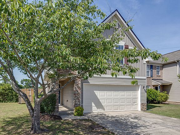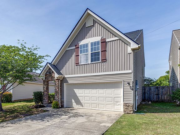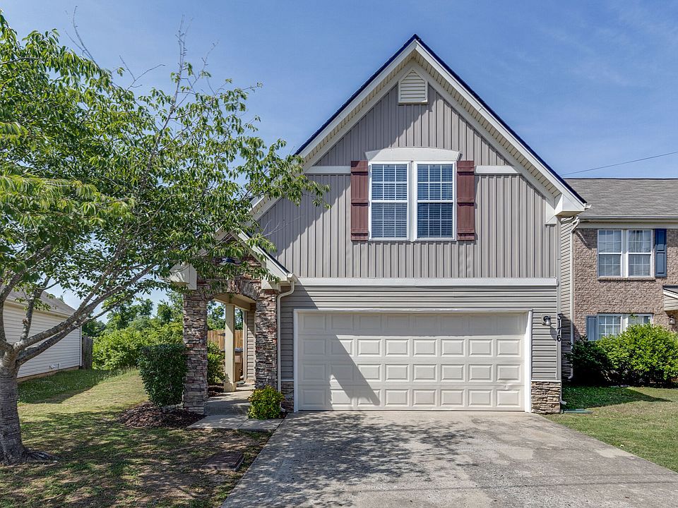 This home is move-in ready with appealing features such as a welcoming arch stone entrance, covered front porch, and an open floorplan. Key highlights include: Neutral paint, luxury vinyl plank (LVP) flooring on the main level and upstairs hallway, and upgraded carpet. Kitchen has beautiful granite countertops, subway tile backsplash, and trendy blue cabinets. All bedrooms and the laundry room are located on the upper level. Large primary suite featuring two walk-in closets, sitting area and spacious bathroom. Oversized and painted two-car garage that includes an electric mower and charger! Private courtyard patio. Roof is 3 years old, and both the HVAC and hot water heater are newer. Shows great!