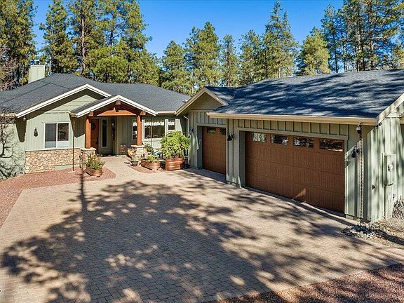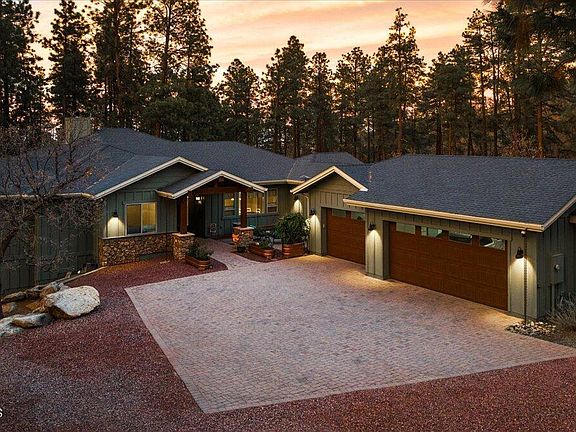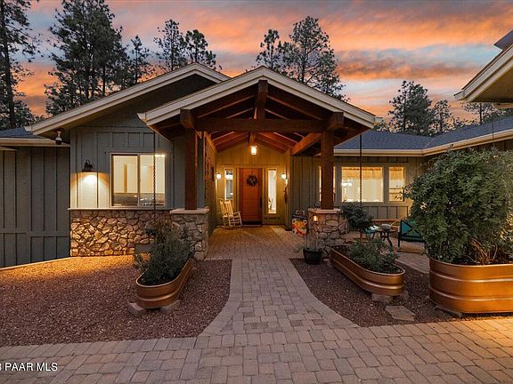 Relax and listen to the trees sway in the wind with this luxury home surrounded by majestic towering ponderosa pines and adjacent to the Prescott National Forest! Set on 2.29 acres and located a mere four miles from the center of downtown Prescott, this property is just outside of the city limits and ensures easy year-round accessibility to this tranquil and secluded retreat so close to town. Entertain in style in the roomy great room featuring soaring, high-volume vaulted ceiling, hand-scraped wood floors, floor-to ceiling rock surround wood burning fireplace, with a wall of windows capturing the incredible forested-view setting inviting the outdoors inside and establishing a seamless connection with the natural surroundings. The kitchen is a chef's dream with granite counters, two-tone