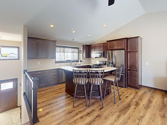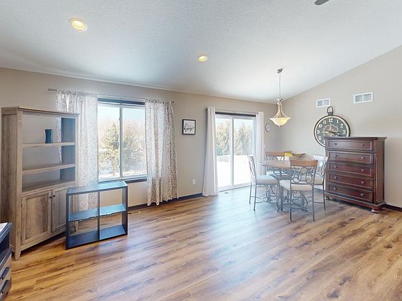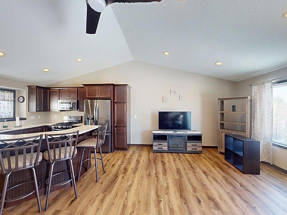 This newer constructed 2-bedroom, 2-bathroom home in Lindstrom features an open floor plan with a combined dining, kitchen, and living room area. The kitchen boasts granite countertops, a center island, manufactured hardwood floors, and stainless steel appliances, complemented by vaulted ceilings. Upstairs, the home offers two bedrooms, including a private primary bath with a tiled shower, as well as an additional half-bath and laundry facilities. The lower level is unfinished with a walkout to the backyard--leaving opportunity to finish off and expand your livable square footage/build equity! This charming home also includes an insulated three-car garage with a concrete driveway. Located across the street from Morning Sun Park which offers a half-court basketball area, play structures, benches, and picnic tables. Just a short drive to Sunrise Lake or North Lindstrom Lake.
