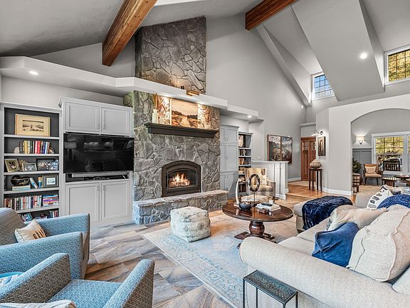 Gracious single-level home embodies timeless elegance & modern luxury. Offering versatility w/ its 3-bedroom main residence & additional 1-bed/1-bath guest quarters with private entrance. As you step inside, an impressive great room welcomes you w/ abundant natural light & a stone fireplace infusing the living area w/ sophistication & warmth. Elegant den w/ paneled wainscoting can serve as formal dining, while the heart of the home is its gourmet kitchen, w/double ovens, breakfast bar, prep sink, pantry & dining area leading to expansive deck. The primary suite is a sanctuary of refinement, w/ private deck overlooking backyard & a double-sided fireplace gracing the bedroom; extending its warmth to the bath, w/ dual sinks & soaking tub. Addtnl guest rooms & separate guest quarters, offer comfortable retreats for family & visitors. Charming front porch provides a warm welcome, while the backyard, w/ hot tub & mature landscaping, offers space for outdoor enjoyment. Spacious 3-car garage