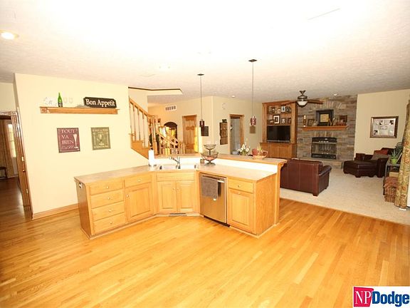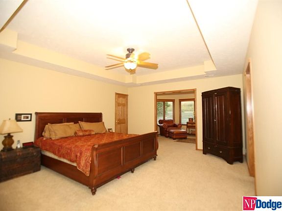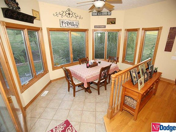 Come enjoy the peace and quiet of the country with city convenience. Located right across from the neighborhood pond, rolling hills and space to roam, but just minutes to the Omaha metro area. 5 bedrooms, 4 baths, plus exercise room, wrap around porch, fully finished basement, main floor office and storage galore. Large open kitchen with hardwood floors, sunroom overlooking backyard and brick patio, a master sitting area plus custom built in cabinets throughout and more! A must see! AMA