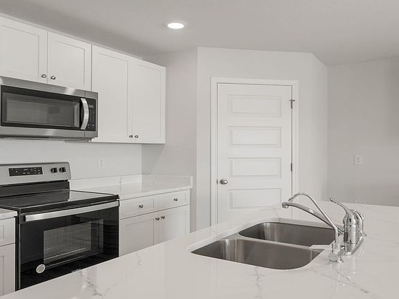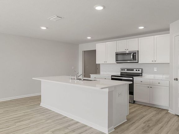 As you enter this 4 bedroom, 2 bath home, you will be amazed by the spacious living space. Inside you will see 8' ceilings throughout, engineered vinyl plank flooring throughout the main areas, and soft carpet in the bedrooms. Beautiful quartz countertops, white cabinetry and a spacious open living room and kitchen make this home perfect for having guests over. The kitchen has a large center island with cabinets underneath, ideal for serving food and extra storage and is finished with a stainless appliance package including a smooth top stove, microwave and dishwasher.
