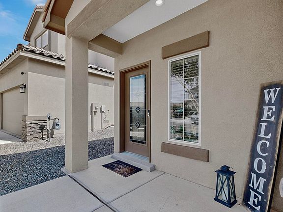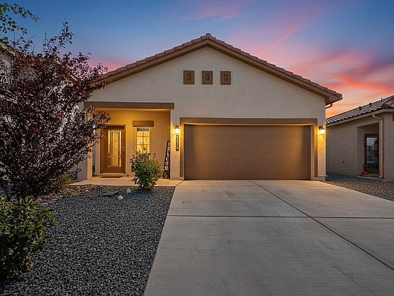 Welcome home to your turnkey D.R. Horton home in the desirable community of Los Diamantes! Home features 3 bedrooms, 2 full baths with open floor plan and modern design. Walk into the larger Scarlette floor plan with granite countertops, SS appliances with upgraded French door refrigerator, tile backsplash and tile floors throughout family room. Large primary bedroom with walk in closet with shelf system, frameless glass shower and marble double sinks. From the bedroom step out to your maintenance free xeriscaped backyard which is the perfect place to enjoy views of the sandia mountains on your paved patio. Other upgrades include gas line connection for grill, blinds and gutters. Home is in great location near shopping, restaurants, rust hospital and more. Schedule your showing today!