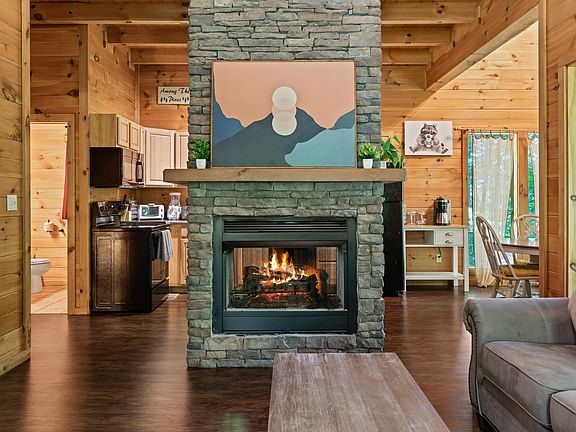Step inside to soaring ceilings and an open-concept living area centered around a stunning see-through stone fireplace—creating a warm and inviting ambiance for cozy evenings or lively gatherings. Recent updates include all-new LVP flooring on the lower level, a remodeled top-level bathroom, a new hot water heater, freshly stained exterior (March 2023), pest-sealed exterior walls, a paved driveway, and all-new furnishings, mattresses, and TVs.
