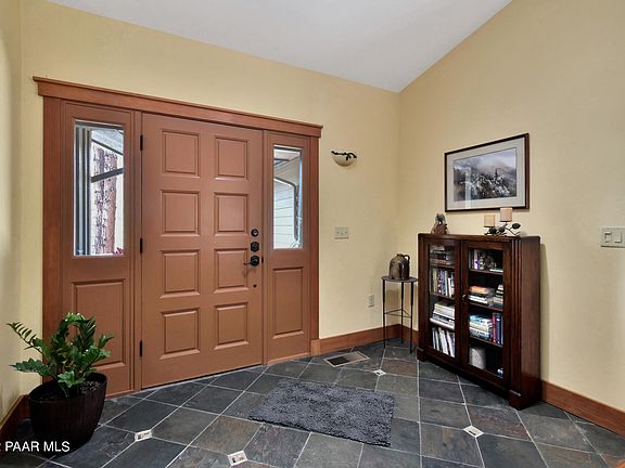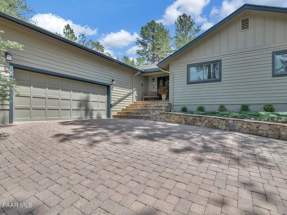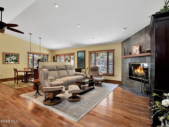 STUNNING HOME SECLUDED IN THE PONDEROSA PINES! This home has a ton of upgrades starting w the fully paved driveway, beautiful rock stone & flagstone stairs leading up to the entrance. BIG open floor plan w Brazilian hardwood floors throughout, tile fireplace & lots of natural light exposure. Custom kitchen w Pecan wood cabinets, gas range, Marble counters and oversized pantry cabinets. This kitchen has more than enough prep and storage space. Spacious master bedroom- master bath was redone in 2021- Porcelain tile flooring, exhaust fan has heater & night light, new Kohler toilet w smart bidet. It has his and her sinks and walk in shower. Outside is pure sanctuary, surrounded by trees, paved patio w power for small fountain & attached garden shed. Large loft added to the garage. *MUST SEE*