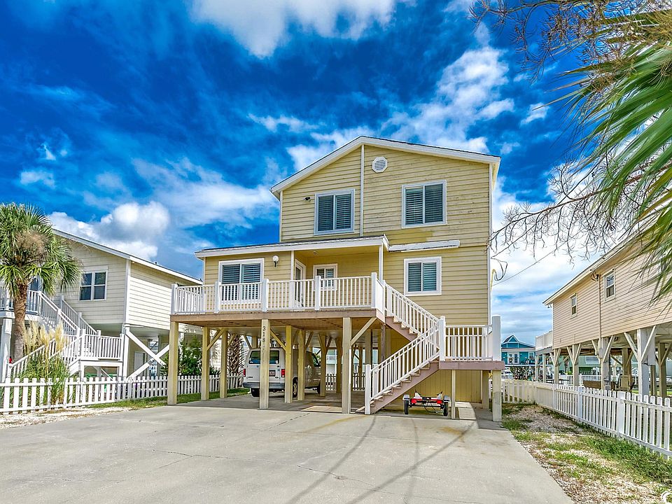 Waterfront Channel living at its finest! You are going to love this furnished 4 bedroom, 3 full bath Channel home with a unique open floor plan with all the bells and whistles. When you walk in you will notice the soaring vaulted ceilings, newly upgraded kitchen with stainless appliances, granite countertops, plenty of cabinetry and kitchen island. Home boasts Plantation shutters throughout, tile floors on main living area and bathrooms, carpet in bedrooms. Master suite is located on main level along with additional guest bedroom. Upstairs features an open walkway over looking main living area, loft area and spacious guest bedrooms . Relax on the partially covered back balcony and overlook the channel or take in the views from front porch. This well maintained home is only a block from the beach and sits on a deep water channel. Would make a perfect primary residence, vacation or investment home!