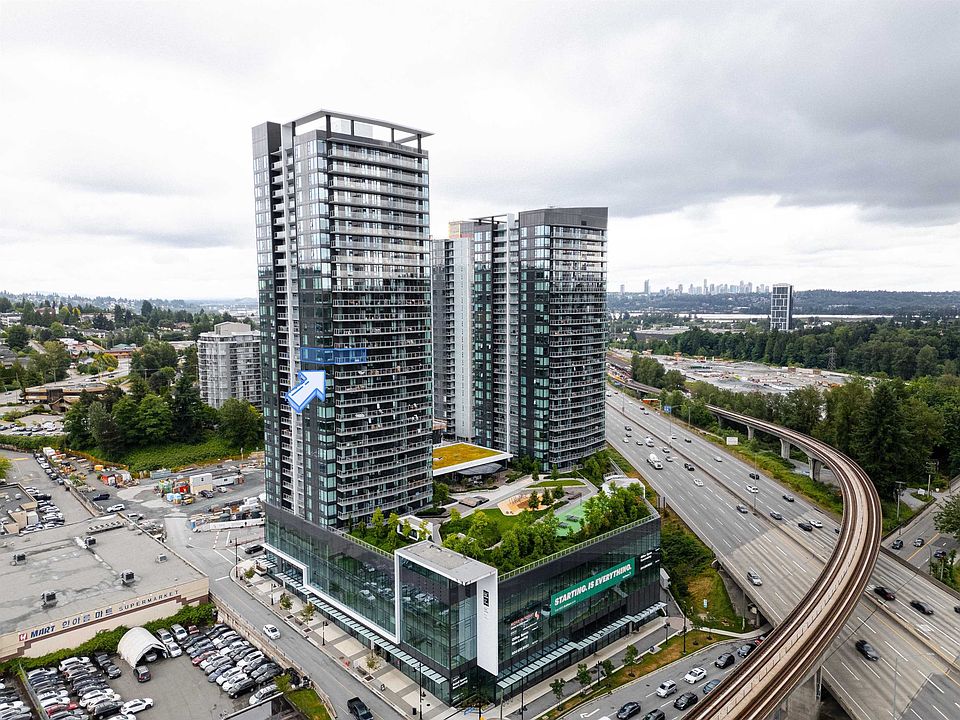 SOCO North Tower. Sweeping PANORAMIC VIEW. 841sf 2 bed 2 full bath. Bright Corner unit with open lay out. Heat pump/ AC, spacious rooms, hardwood laminate flooring, built in Bosch appliances, gas stove. One parking and one locker. Complex has 43,000sf of indoor and outdoor amenities including: entertainment sized lounge, basketball court, outdoor playground, table tennis area, study area, bbq area, guest suite, and fitness room. Minutes of walking distance from vast array of shops, restaurants and services. Also walking distance to Lougheed Skytrain Station and Bus stops. Very easy and close to HWY #1 and Lougheed HWY access.