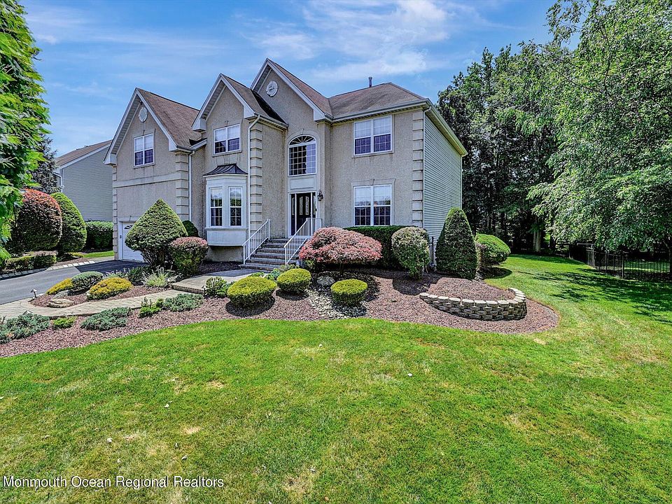 Stunning Home in desirable, ''Marlboro Pointe'' Morganville section of Marlboro Twp. 4 Bdrms + Study, 4 Baths, Fully Finished Basement! Just unpack and move right in! Elegantly appointed Two Story Foyer w/ Newer Flooring & decorative moulding. Custom Remodeled Kitchen Proudly designed by, ''Vaccaro Brothers'' made of the Finest Quality Cherry wood w/ many upgraded features including; detailed wood trim, wider crown moulding, soft close drawers & doors, a pot filler faucet over stove, pullouts, granite counters, s/s appliance package w/5 burner Decor cooktop, double oven & built-in microwave. Kitchen opens to a Two Story Family room w/ wood burning F/P, and back staircase. Kitchen slider leads to new Timbertech vinyl Deck overlooking private & professionally landscaped yard, fire pit area.. and plenty of room for kids to play. Finished basement includes Full Bath, gym area and open space. Spacious Master suite bedroom including an ensuite bathroom with whirlpool Jacuzzi Tub, double sink counter & toilet closet, walk-in closet equipped with professional built-ins. Extra closet for storage. Large kids bedrooms w/ walk-in closets also equipped with professional built-ins. This stately home is within close distance to buses, train and shopping. Centrally located in Morganville. Impeccably kept home which has been freshly painted! Truly ready for the next growing family!