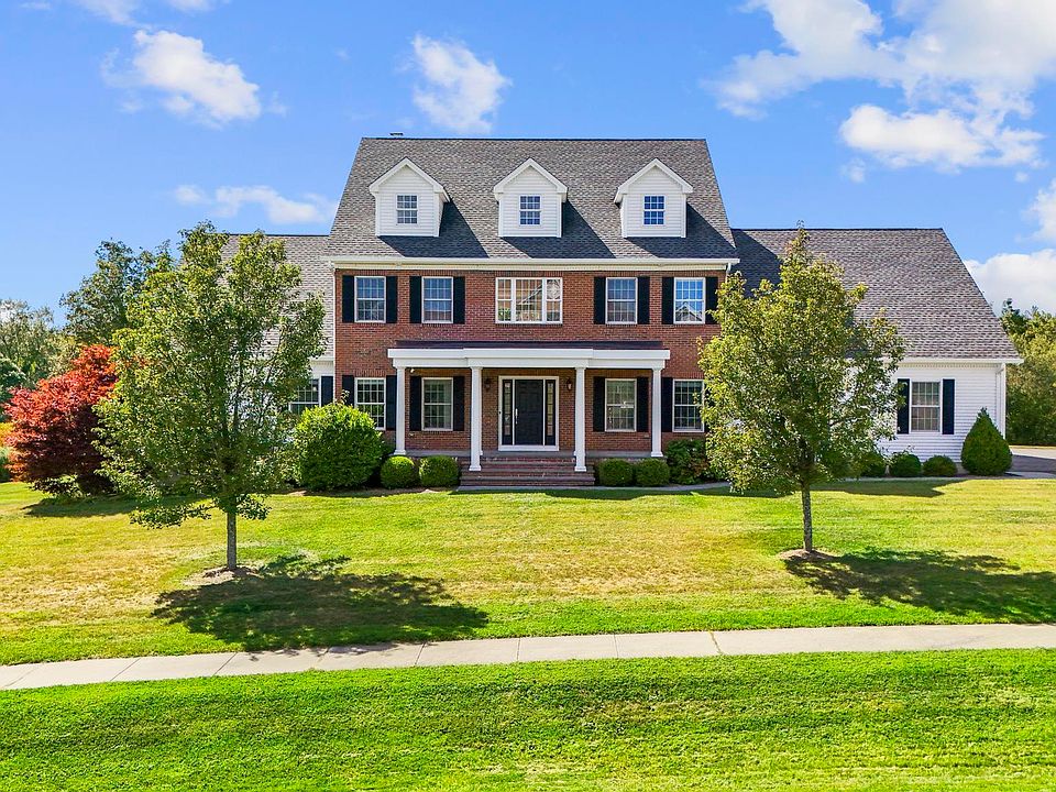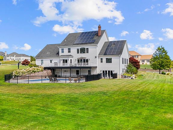 Stately Colonial with Grand New England Charm! This extraordinary 4 bedroom residence combines timeless design, fine craftsmanship, & modern comfort. Enter through the dramatic two-story foyer, where intricate millwork, high-quality interior doors, & premium hardware set the tone for refined detail throughout the home. Oversized windows flood the interiors w/ natural light, showcasing gleaming hardwood floors & lofty ceilings. A private office w/ custom built-ins creates a functional work space, while the spacious first floor primary suite serves as a private retreat w/ a spacious walk in closet & luxurious en suite bath. The gourmet kitchen boasts white shaker cabinetry, granite counters, a large center island with ample seating, plus a built in desk and bar. Adjacent, the two story great room is a showpiece with a dazzling chandelier, dual custom fans, balcony overlook, classic built-ins, & a striking gas fireplace. Glass doors lead to an outdoor space w/ a composite deck, heated pool, covered patio, & wide, flat yard ideal for entertaining. Upstairs, 3 spacious bedrooms with walk in closets awaits. One offers it's own private en suite bath, while the others share a full hall bath. Expansive, full size walkout basement comes with soaring ceilings, abundant space & half bath. Highlights include: 3 car garage, efficient hydro air HVAC system, new 100 gall hot water tank, advanced radon mitigation system, water filtration systems, central vac, & a generator-ready power panel. Contingent upon seller finding suitable housing. He is actively looking. Solar panel agreement transferable to new buyer. Please see disclosures for electric bill history, and solar panel details. ***Tax record does not reflect correct number of bathrooms. 5 total. 3 full and 2 half baths***
