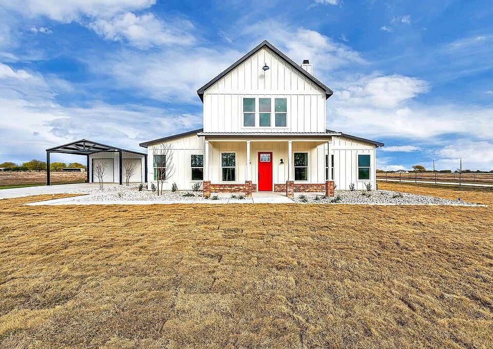 Outside the home will be a long concrete driveway, great for fun and playing with the children. Will be sodded with sprinkler system, walkways between garage/workshop and the house. Will be partially fenced. Front and back porch for relaxing, wine sipping and watching incredible Texas sunrises and sunsets. A massive 2 door garage with carport/workshop/barn. Shop area is 24 X 30... Including Carport its 24 X 50.