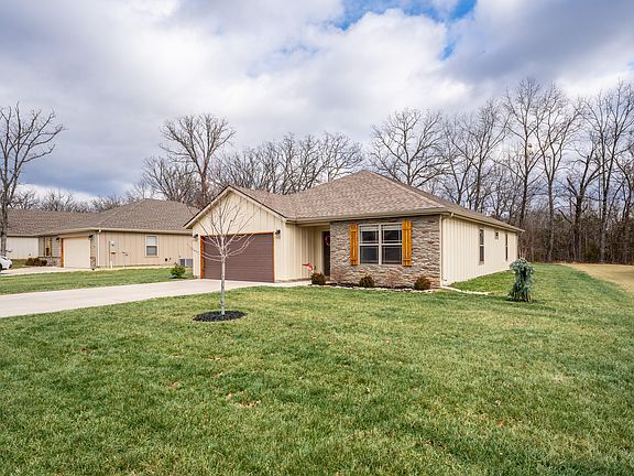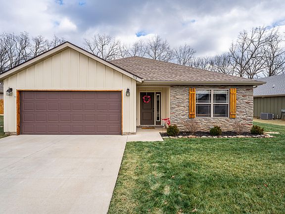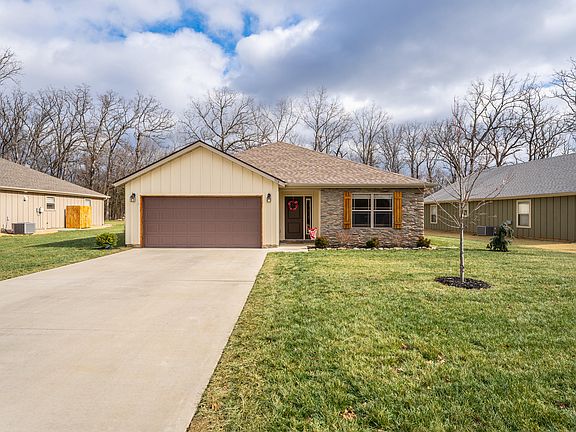 Wow discover serene and peaceful living in this charming 3-bedroom, 2-bath, 2 car garage home located in the prestigious Stonebridge Village Gated Community! This turn-key, single-level home with no stairs offers a seamless blend of comfort, style, and convenience.The beautifully updated kitchen features a new backsplash, porcelain farmhouse sink, rubbed bronze finishes, a very nicely large granite island, and stainless appliances--perfect for hosting gatherings or quiet family evenings. The cozy living area, highlighted by tray ceilings and an elegant Propane FIREPLACE makes for the ideal retreat, and the SOFA is included! Relax in the tranquil primary bedroom with a walk-in closet, walk-in shower, and large windows offering nice views. The garage adds convenience with built-BUILT-IN STORAGE, a WORKBENCH, and a water softener.The spacious backyard is perfect for peaceful evenings or entertaining block gatherings, with room for BBQs, family fun, or creating a pet-friendly oasis with optional fencing. CAN BE FENCED.Nestled in the serene Stonebridge Village, the neighborhood is known for its warm community gatherings and resort-style amenities: gym, 2 swimming pools, pickleball and tennis courts, playgrounds, trails, pavilion, golf discounts, and clubhouse dining. Plus, you're only 10 minutes from Table Rock Lake and Silver Dollar City! You Don't want to miss your chance to make it yours! CAN BE FENCED