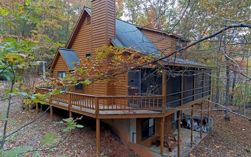 Fantastic one owner mountain cabin in great condition, wit loads of privacy and seasonal views of the north Ga mountains which could be improved greatly with some tree trimming. Great room offers gorgeous fieldstone fireplace, with cathedral ceilings and a nice mixture of wood and drywall with beautiful hardwood floors. Kitchen features custom cabinets and plenty of room for full time living or second home. Main floor bedroom is roomy enough for a master bedroom if needed, and upstairs master is very roomy with full walk in closet and private bath. Wrap around porch/deck has nice views off screened porch in back. Walk out basement is unfinished but is stubbed for 3rd bath, and has great concrete patio outside.