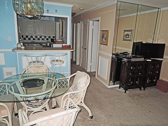 Looking for a home away from home that is furnished, then this is it. This 1 bedroom, 1.1 bath w/washer/dryer in the unit is ideal for a seasonal home. It features chair & crown molding along with some wood inserts in dining area. Kitchen has some newer appliances, including an extra small fridge. Full size washer/dryer in laundry area + extra shelving for storage. 1/2 bath features a newer mirror & light fixture. Windows in FL RM are not original, + vinyl tiled floor & verticals. Custom mirror in living area, unit needs new flooring. Monthly condo fee is low & Includes: water, sewer, trash pick-up, Cable TV, Internet, Lawn care, maintenance on exterior of building including roof, 24-hour manned gate, + all amenities. HURRY CALL NOW!!!