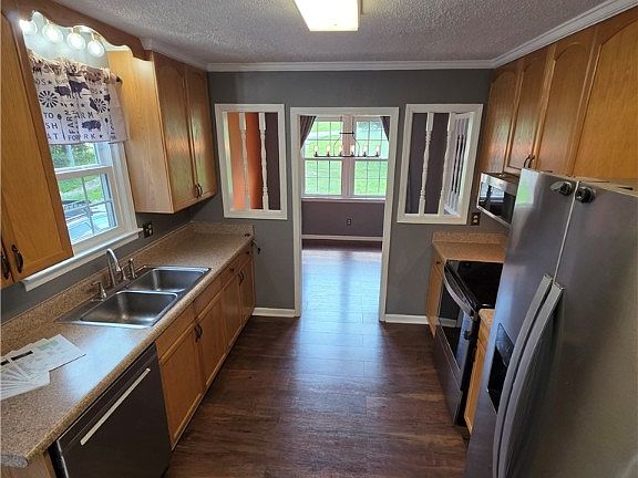 Rustic brick fireplaceHuge deckGalley style kitchenStorage buildingFenced backyardFormal dining areaDouble vanity