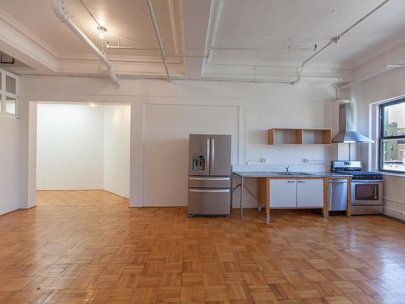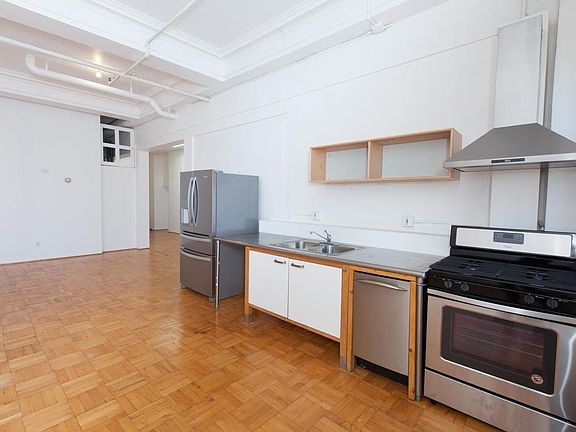 No fee, rent is $3350/mo with first month free rent, for a net effective rent of $3000/mo over the course of the first year. Beautiful no-fee penthouse loft apartment with skylight and views from Williamsburg into Manhattan. Its bright in any weather, and features high ceilings and plenty of open space to lay out however you want. Full kitchen with stainless steel appliances, and generously sized bathroom with tub and 10 ft ceiling.