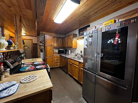 30x60 shop w 16 ft height wall & 12.5 inch thick walls w a 1200sf 1BR/1BA home inside. Fire retardant triple insulation, window unit heat & air, LED lights, knotty pine ceiling boards, crown molding is walnut, Spanish oak cabinets in kitchen on 10.67ac. There is a wet weather creek, tons of trees & deer! Appliances will be replaced w black appliances - agent can provide photos. Area over home has a stair case and is plumbed & easily converted to more living space