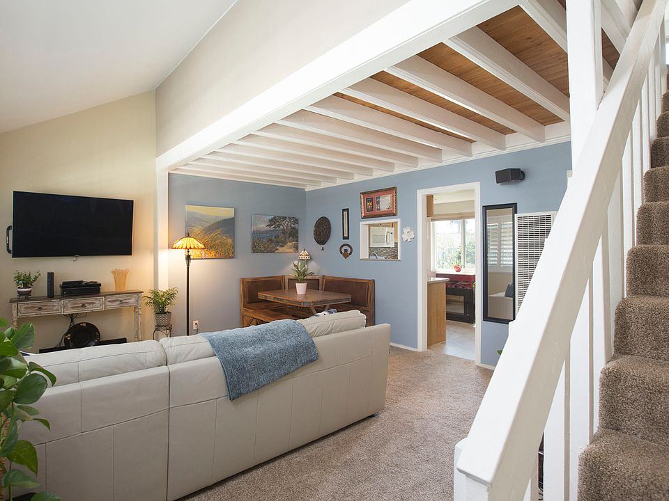 Call Listing Agent Michele to schedule private showing. (619) 980-6501. Perfect location 1.5 blocks to beach. This 1 Bed 1 Bath charming bungalow is move in ready. Top Unit with no one above or below, looks out over a orchard and has a "peekaview" to the ocean. Newer windows, appliances, carpet and granite in the kitchen with glass backsplash. Upstairs loft bedroom with skylight and office/study with built in desk by artist "Ding King". After surfing wash off with outdoor shower, store belongings in 10 x 10 shed. Gated complex with assigned carport and 1 assigned parking. Low HOA $177/month. Hurry this one wont last!