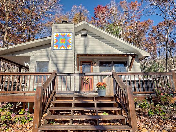 Walk to Lake BR!! Quaint and Quiet, Rustic Charmer is nestled on gentle wooded tract in upscale paved community just minutes from historic downtown area and Lake BR Marina - surrounded by the mtns & towering hardwoods! This stunner is "cute as can be" with 2 bedrooms/1bath + large living/kitchen/dining area with cathedral ceilings that open to a large covered porch & wrap around deck amid lush mountain landscape, wood floors & interior along with warm stone fireplace, rustic kitchen, gentle driveway with plentiful parking and easy access in upscale paved rustic community, just a short bike ride from lake side walking/hiking trails...perfect for that much needed getaway cabin or great for vacation rental - prime area - this one won't last long