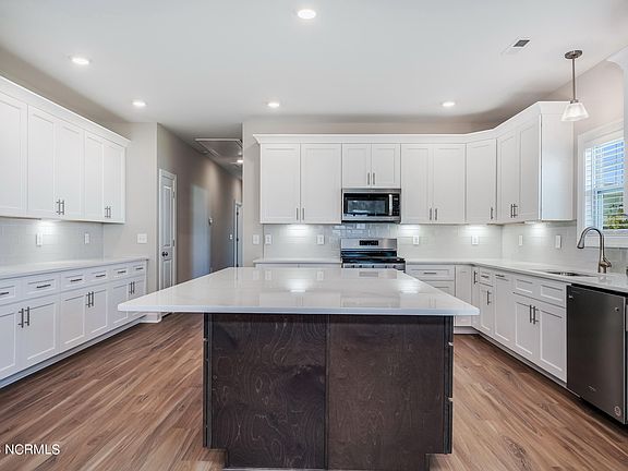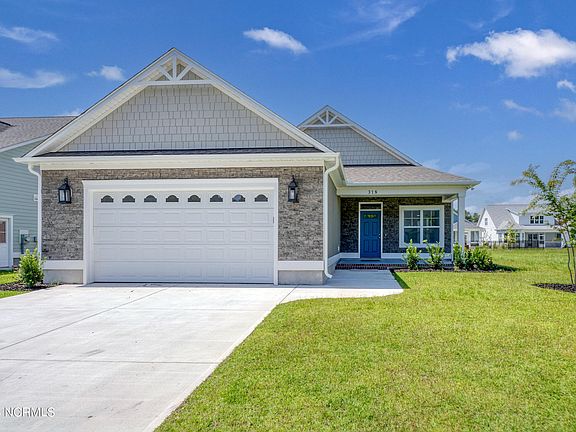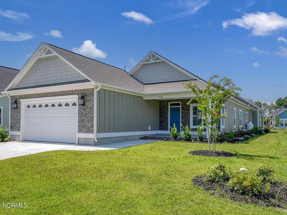Welcome to Summerhouse on Everett Bay. North Carolina Resort Style living at its finest. This beautiful single story 4 bedroom/3Full bath home is designed for comfort and ease. The Fiber Cement Board 'N Batten & Shake Siding With Stone Front provides AMAZING curb appeal! Inside, the beautifully designed kitchen features custom cabinets, gas cooktop stove, quartz countertops, large pantry, and a large 5x7 island. The open floorplan takes you into a large living room with vaulted ceilings. 9 ft ceilings throughout the rest of the home gives a nice, spacious feeling. Luxury Vinyl Plank flooring throughout. The Master Bedroom features a 12'' tray ceiling, an Extra large walk-in closet, tiled walk-in shower with a 6' bench seat and a dual vanity. The other two baths each feature a 3x6 ft. deep soaker tub. The entire home has gas powered Hot-Water-On-Demand. Finally, it's time to relax and sit peacefully out on your screened-in back porch and listen to the birds. Enjoy the many lakes and beautiful landscaping of the gardens. Play some tennis, pickleball, basketball, work out in the fitness center, or relax in the spectacular clubhouse and pool. If boating is your thing, there is a day dock with ICWW access and boat storage. Make your appointment to see all of this today!
