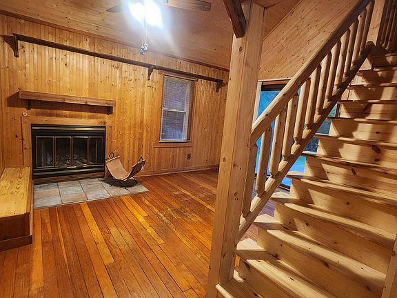 Needs some work and updating, but regardless you'll love the welcoming rustic interior this home offers. Cute and cozy with log cabin accents. The main living area features high, vaulted wooden ceilings and a fireplace, creating a sense of being in the North Woods. Most walls have natural wood paneling that gives the space a warm and inviting ambiance. Adjacent to the living room is a small den. It's possible to remove the wall to have a larger living space. The hardwood floors have character and its vintage feel adds to the home's charm. Upstairs is a loft master bedroom and bath. Many newer features include a new hot water heater, and stackable washer/dryer. The siding has been updated. Being sold "as-is." Located on a large wooded lot with woods and a stream behind the property. Huge detached garage and an ideal setting makes this property a great place to come home to.