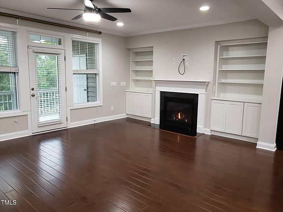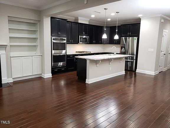 Gorgeous 3 Bedroom, 3.5 Bathroom, 1-Car Garage Townhome with Finished Basement in Harrison Bluffs, Cary. Available July 25! Enter into a open-floor layout with Engineered Hardwood flooring throughout the main level! Beautiful kitchen with a large kitchen island, featuring tile backsplash, pendant lights, granite countertops, and stainless steel appliances, including a gas cooktop and french door refrigerator! Spacious living room with Ceiling fan, gas fireplace, built-in shelves, and access to back balcony w/ exterior storage closet! Upper level features a lovely primary suite with double walk-in closets, primary bathroom with double vanities, walk-in shower, and a Garden Tub. Top level also includes, 2 secondary bedrooms, a full bathroom with a double vanity, and laundry room with washer & dryer! Spacious, finished basement level with bonus living room space, full bathroom, and access to covered back patio! Perfect for recreational space or lounge area! Easy access to I-40, Harrison Point Shops and Grocery shopping, Umstead Park, RDU, RTP! Must see! The pictures were taken before the current tenant.