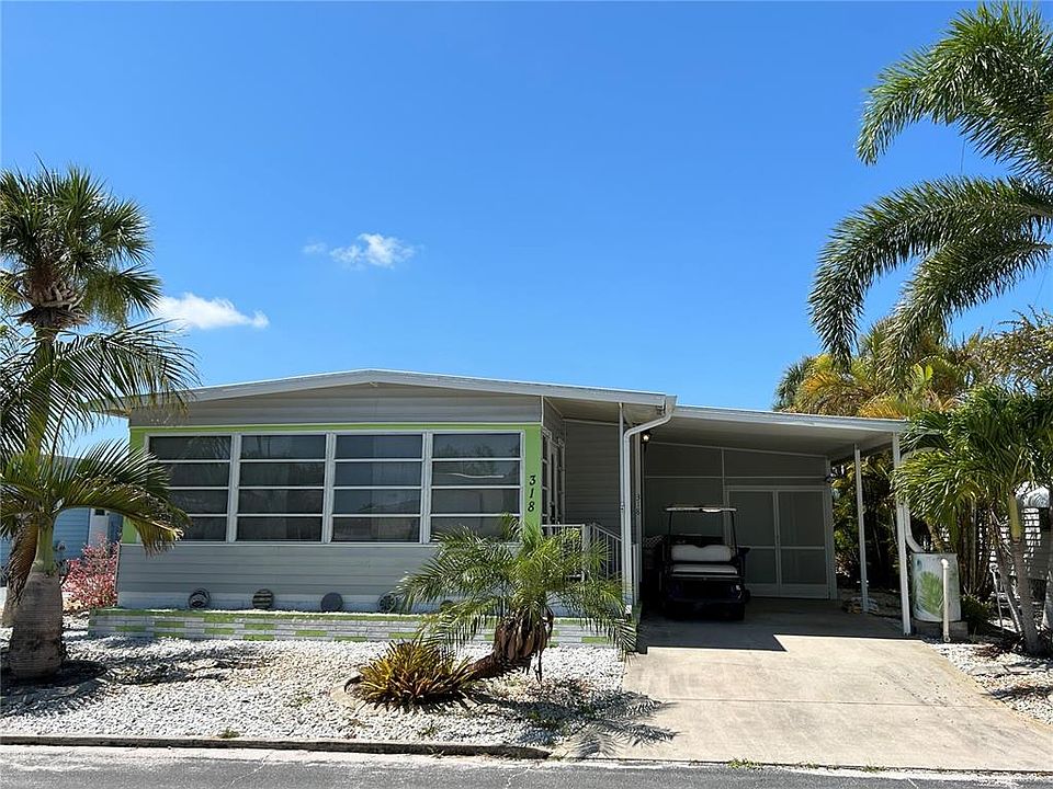 Venice Isles is a beautiful 55+ Mobile home community. It offers several lakes strategically located throughout the community. There are many amenities including, pools, hot tubs, horse shoe pits, shuffle board courts, out door grill for family picnics, community buildings, a gym, tennis courts, and many other opportunities to make the community your own. This home offers 2 bedrooms and two baths, a large enclosed front porch, a beautiful screened lanai. plenty of storage, a workshop, outdoor shower and it is conveniently located within the community. Everything you see stays with the property. The dining room and living room are conveniently connected to give a spacious feeling. The kitchen includes the appliances and a great pantry. Plenty of cabinets and opens beautifully into both the living and dining rooms. Both bedrooms and bathrooms are located at the back of the home. This property has a lot to offer it could easily be a full time residence or a winter home. Take a look for yourself. The location to beaches, shopping, theatre, restaurants and beautiful beaches are great assets to this property and community. The roof has been replaced, Roof Over 2022, Water Heater 2022, AC 2021.