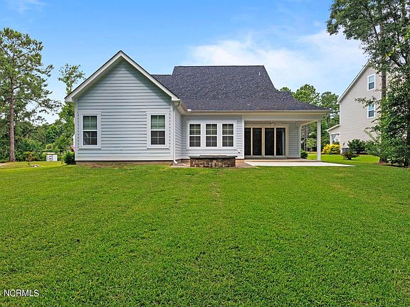 Easily accessible off of the kitchen, the laundry room provides ample storage. The first-floor primary bedroom with en- suite bathroom showcases a custom 78'' tall glass shower door, naturally veined marble countertop, and spacious closet. Following the widened 39'' staircase to the second floor, you will find a large flex space, 3 spacious bedrooms, oversized closets, and 2 full baths with quartz countertops. The backyard is accessed through the living room's telescoping doors where you can relax under the covered porch or by the custom outdoor gas fire pit. This fully irrigated lawn wired for an Invisible Fence also has side-entry garage access. Enjoy coastal outdoor living at its finest with tree-lined sidewalks, mature neighborhood landscaping, and community amenities including a pool, playground, and day-dock with kayak launch. Make these new memories in your beach home with *2 resident virtual Surf City beach permits (1 per car) provided at no cost to Town of Surf City property/parcel owner!