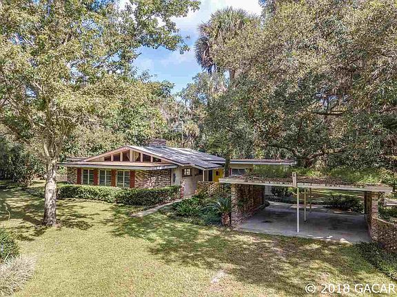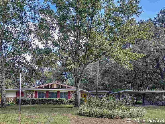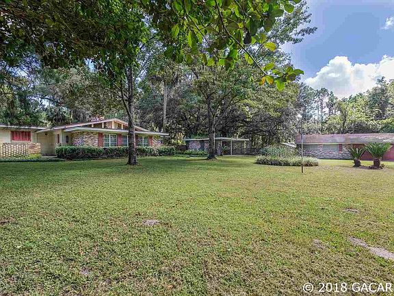 ***BACK UP OFFERS ACCEPTED** Enjoy the privacy of 29.1 acres while only 11 minutes from Gainesville at 1-75 and Williston Road. As you enter the privacy gate you are greeted by the most majestic line of Oak Trees. This mid-century modern home is nestled on approx. one acre and was built in 1963. It holds all of the charm of its original interior with Terrazzo floors and the original kitchen and bathrooms. High vaulted ceilings in the living room and family room with stunning wood beams. Cozy up to two fireplaces. Massive grandfather live oaks are a picturesque back drop to enjoy for years to come. Also enjoy the many fruit trees like citrus, fig and kumquat trees. In the spring take in the beauty of the azaleas, palms, camellias and more. Don't miss the RV and boat storage shed/out building and the 2 car garage and out building. Currently AG zone and suitable for planting and harvesting of pines, livestock, and farming. This is a rare opportunity to have the privacy you seek and still be a quick drive to Gainesville, Micanopy and Ocala.