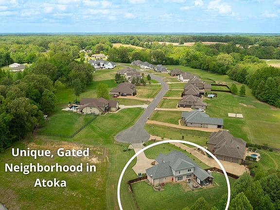 Rare Opportunity in Atoka's Exclusive Gated Community! This stunning custom-built home offers an exceptional blend of space, functionality, & thoughtful design. With 4,100 sqft of living space, this home features 4 spacious en suite bedrooms, an office, & a lofted bonus room—perfect for a variety of lifestyle needs. The versatile floor plan includes 2 bedrooms & 2.5 baths on the main level, with 2 additional bedrooms and 2 full baths upstairs. Designed for convenience, the home offers dual laundry rooms—one on each floor—and an expandable attic space already equipped for a future bedroom & bathroom if desired. The expansive 3-car garage includes an oversized single bay w/ a convenient drive-thru feature for easy backyard access. The heart of the home is the large eat-in island, providing ample space for gatherings and everyday living. Step outside to enjoy the huge covered patio, an ideal setting for entertaining or relaxing while overlooking the beautiful scenery.