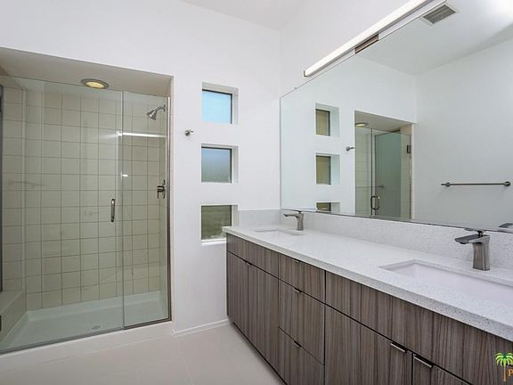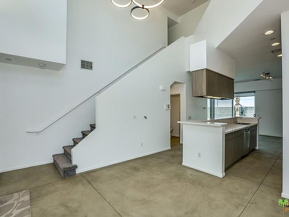 This is the finest home at the popular Modern Architectural Palermo community. Not only does it have the largest lot and some of the best views in the community, it also has the largest private pool and spa. 19' ceilings in the living room with amazing south facing views, concrete floors, new quartz counters throughout and Palisandro Italian Cabinets throughout. Separate living & dining area and downstairs powder bath. Upstairs you will find two master suites, view loft for lounging or office and laundry room. There is a 2nd story deck with views of the north mountains and San Gorgonio, as well as lakes in the community next door. All new bathrooms, shower enclosures & new window coverings too. The backyard is private and attractive with a long pool & elevated spa with spill over. There is an attached garage, long drive with room for 2nd car and abundant adjacent parking for guests. Palermo is a gated community with a fantastic clubhouse, pools, spas & gym. You own the land. Low HOA!