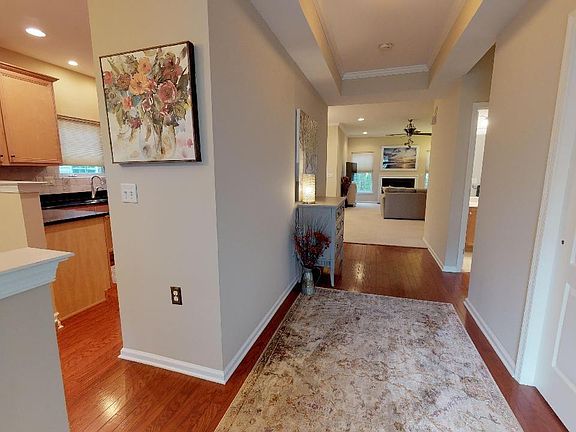 MOTIVATED SELLER .....Beautifully maintained Brookhaven model in the this desirable 55 +,is turn key ready and waiting for you. This home shows better than-new with its upgrades. The entrance welcomes you with its hardwood floors and tray ceilings giving this home a touch of class. Entire home was painted last year and new crown molding throughout finishes off the rooms. Bright and cheerful sun room overlooks the wooded backyard for that-peaceful enjoyment. Gas fireplace in the living room keeps you warm and cozy setting the ambience for company and Holidays.The Master bedroom is spacious and offers 2 closets, one nice size walk in. Upgraded master bath with tile shower and-soaking tub with double sinks. Partially Furnished. Kitchen has stainless SS appliances, and quartz counter tops. Two car garage and attic offers plenty of storage.Washer and dryer not included.