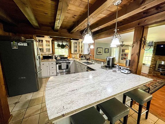 Price reduced! This is the one you have been waiting for! This gracious 3-bedroom 3-bath post and beam Quechee Lakes home is ready for new owners. Situated on one acre of open, flat usable land, you are 1.5 miles from the RT 89 exit to your new VT property! Wonderfully renovated kitchen opens up to a 1995 great room addition with living, dining and a wonderful built ins. Stonework frames an inviting, functional gas fireplace, supplying instance ambience for you and your guests. A second living room area on the front of the house has a Vermont Castings gas stove. The owners have enjoyed the space as a combination office and den. The three bedrooms are all on the second floor, plus a nice office nook off of the landing. The natural beams add great warmth and character. There are three elegant, renovated baths, including one for the master suite. The full baths have radiant heated tile floors! A newly finished room in the lower lever adds a nice bonus space. Deck space is off of the front of the house and also off of the dining area. The latter is perfect for grilling. A detached two car garage-barn offers tons more storage for your bikes, kayaks and gear. The upstairs is full height and has lots of potential beyond storage. Long lasting standing seam metal roofs throughout. There is even an oversized firepit! A wonderful QLLA property! Please see Matterport virtual tour in the link provided. Do not miss this one!