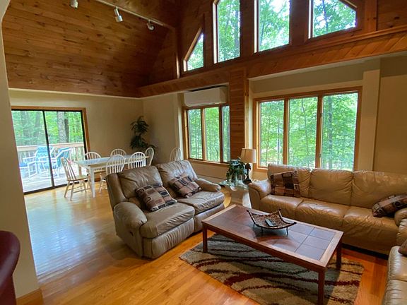 Come see this 4 bedroom, 3 bath Chalet with genuine cedar siding & lots of glass! Big windows offer a view of the lake & it's only a short walk to the beach! Sitting pretty on a beautiful wooded lot at the upscale Eagle Rock Golf & Ski Resort, there is recessed lighting throughout. Spacious living-room is adorned with tongue & groove cathedral ceiling and hardwood flooring,large deck,spacious bed
